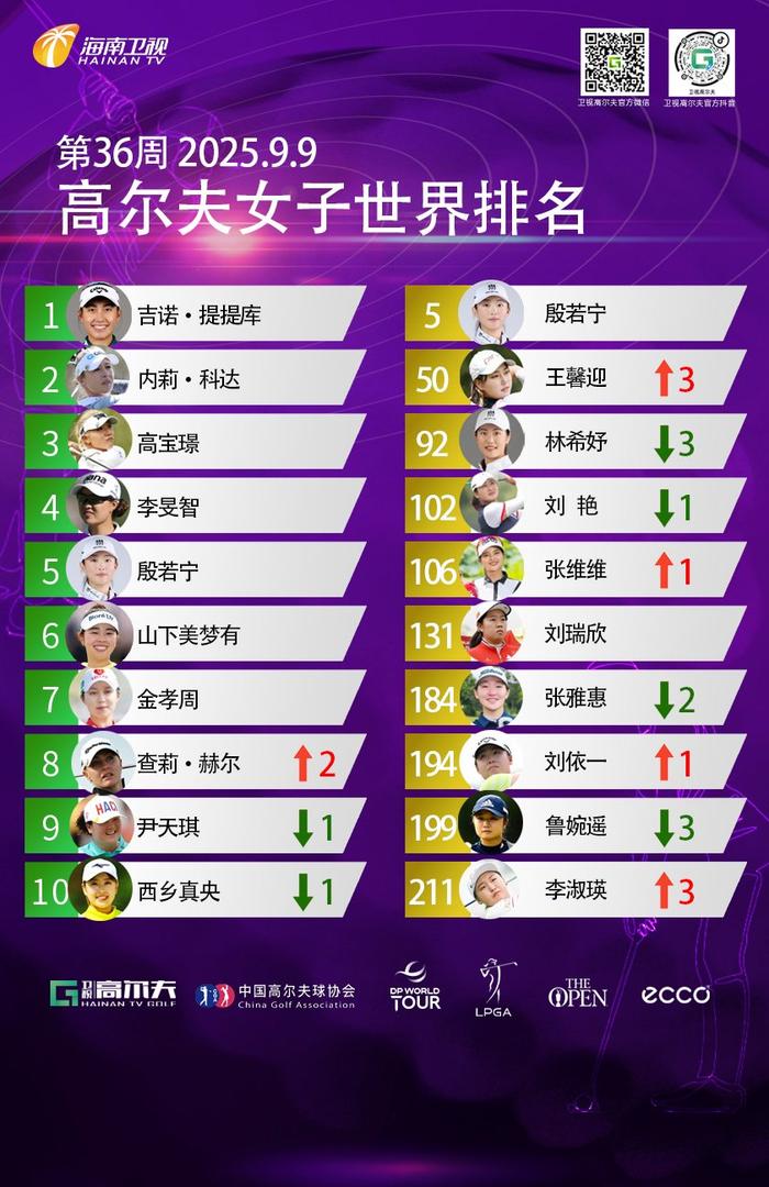 本周世界女子排名,前七位没有发生变化,吉诺·提提库继续保持世界第一,高宝璟排在第三,李旻智第四,殷若宁排在第五,王馨迎提升3位,本周排在第50位。林希妤名次再下滑3位,本周排在第92位。