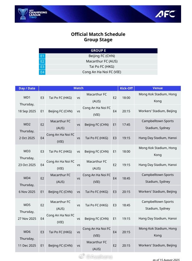 亚足联官网今日稍早更新的亚冠二级联赛赛程信息存在误差,北京国安的实际赛程并未调整(更新仅涉及其他小组标黄内容),首场比赛仍维持主场对阵河内公安的安排,推测为亚足联操作失误上传了错误文件。最终赛程应以中国足协8月25日官网公告版本为准。
